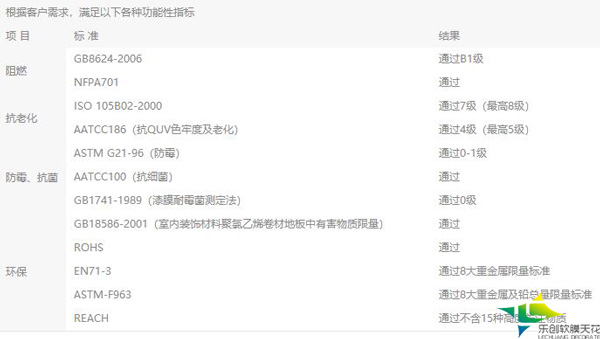 3、防水防潮性:在一般潮濕的環(huán)境下防水防潮表面不結(jié)水露。 除了上述優(yōu)點以外軟膜天花還有很多性能,性能優(yōu)點參數(shù)如下圖: