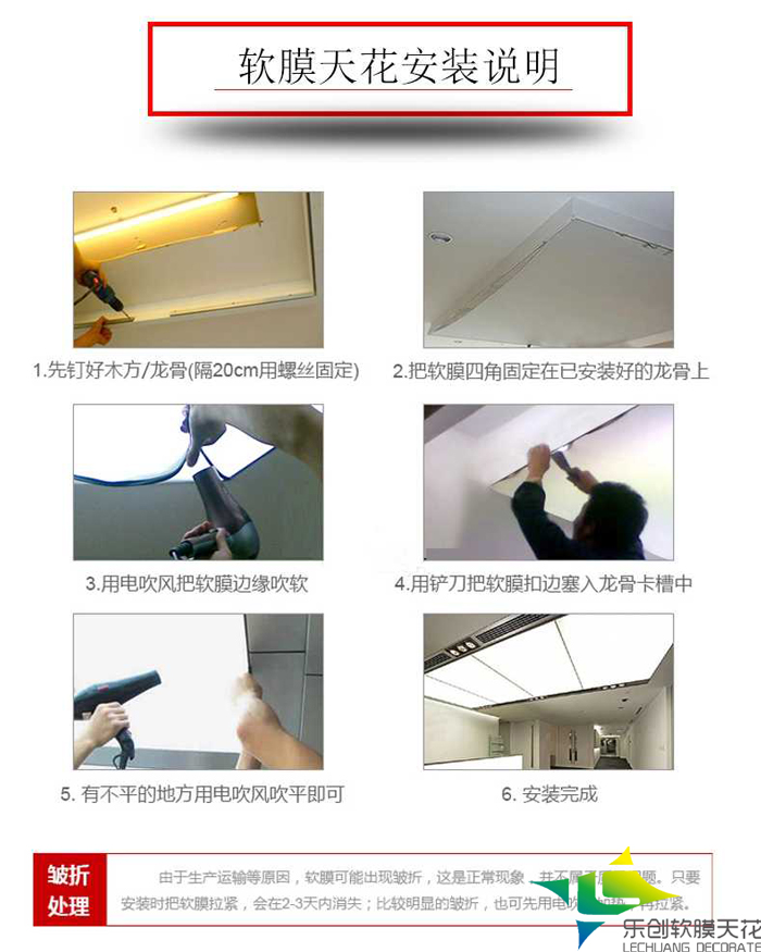 主要分為四個步驟: 1、首先安裝專用龍骨,龍骨型號分為F、H、M,具體的型號安裝大家可以參考本網(wǎng)站其他對應(yīng)的文章,這里就不再贅述了。 2、把生產(chǎn)好的軟膜用專用安裝鏟刀卡入安裝的龍骨卡槽,注意要先安裝四個角,將軟膜整體掛起來。 3、從軟膜四周中間位置對稱打點,將軟膜整體固定好。 4、然后用吹風(fēng)機熱風(fēng)加熱軟膜使其變得柔軟,再把其他空余位置安裝好即可。 注意:特別是冬天天氣寒冷,一定要用風(fēng)機熱風(fēng)或者火槍烤著安裝,廠家發(fā)完貨以后不要著急拆封,可以拿到有暖氣的房間恢復(fù)一下溫度再拆封。 |