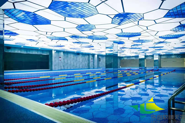 熱烈祝賀我公司徐州游泳館泳池防潮軟膜天花吊頂安裝順利完工并交付客戶使用,此泳池吊頂材料采用我公司高清UV精印防潮天花膜材,內(nèi)藏防水LED光源,透光效果,亮度高無需再做其他照明設(shè)備,整體頂面全部采用我公司專用防潮膜材,安裝效果得到了客戶的滿意,提高了整體裝飾檔次。 實(shí)際安裝效果如下圖: